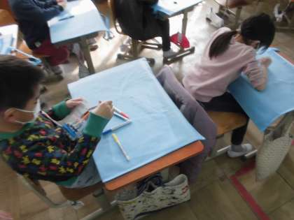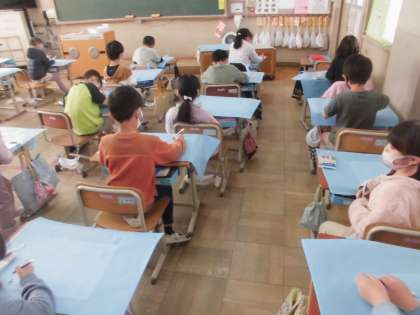 「水遊びしたなぁ」「友達と遊んだ」「総合遊具で遊ぶの楽しかった」など,いろんなことを思い出しながら楽しんで描いています。どんな作品袋が出来上がるか,楽しみです。
