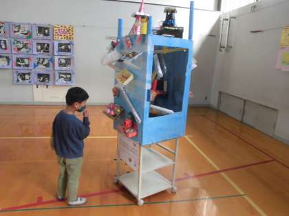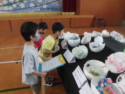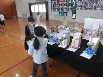 たくさんの作品が並んでいていつもとは違う体育館の雰囲気に子ども達は思わず「いっぱいある」「すごい」と声が漏れていました。