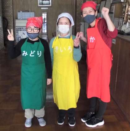 学習の後,3人で3色のエプロンを付けて配膳をし,今日の給食の栄養についても考えました。
