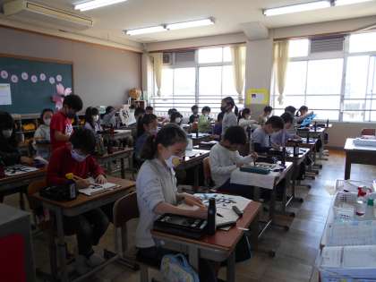 マーブリングの和紙に一発勝負で書く子どもたち。