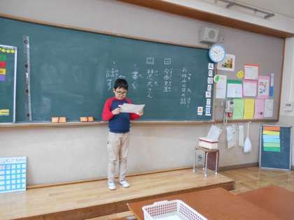 お休みの日のことで,特に話したい事柄を選び,ワークシートに,「いつ・どこで・だれが・何をしたか・どう思ったか」の項目別に書きました。それをもとに発表をし,タブレットで文章にしました。