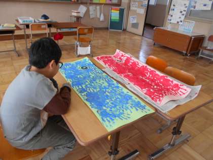 ろ組の前に毎月の季節の飾りを作成して,掲示しています。5月の飾りとして,こいのぼりを作りました。手に絵の具をつけて,ぺたぺたと紙に手形をつけてうろこにしました。元気いっぱいの生き生きしたこいのほりができあがりました。