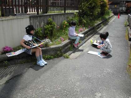 今日の時間割にはなかったのですが,お天気もよかったので,生活科の学習で外に出て「春みつけ」をしました。一人ひとり「マイたんけんバッグ」に紙をはさんで,そこに見つけた春の草花や生き物たちを絵で描きました。今年はさくらもチューリップもすっかり花が散ってしまっていましたが,運動場の外回りの花壇には,まだいろいろかわいい花も咲いていて,その中から気に入ったものを選んで描いていました。最後の方にはダンゴムシを見つけて,私のところまで見せにきてくれた子達もいました。