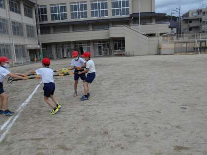 6時間目の体ほぐしの運動では,大縄跳びとボール運びリレーをしました。
