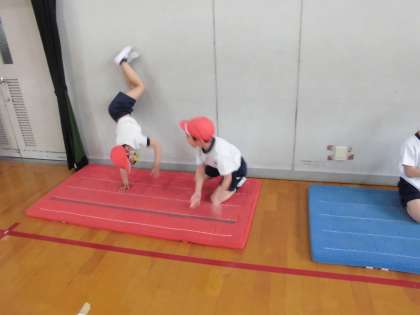 体育の体ほぐしの運動では,いろいろな動きを楽しみました。体全体を使って「体じゃんけん」「アシカ歩き」「クモ歩き」「逆立ちじゃんけん」いろんな動きを使って,大きなすごろく遊びをしました。