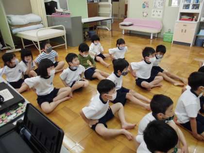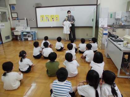 今日は 保健室で身体計測をしました。まず上田先生から保健室でのやくそくについて教えていただき,そのあと「ほねのはなし」についてお話を聞かせていただきました。1年に3回ある身体計測の時には,必ず「からだ」についての興味深いお話や時には実験もしてくださり,子ども達は毎回楽しく学習させてもらっています。今年のテーマは「ほねときん肉を強くしよう」ということで,今日は「ほねだ こつこつ先生」が登場してきてびっくり!頭の先から足の先まで子ども達もいっしょに体中のほねを触ってたしかめました。