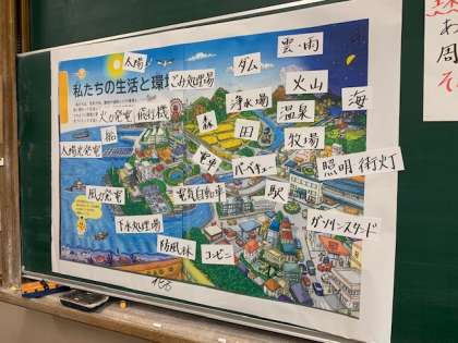教科書のイラストを見て,私たちが空気や水,動植物など様々なものと関わりながら生活していることが分かりました。