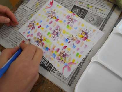 色を濃くしたり,紙を半分に折って左右対称のもようにしたりと