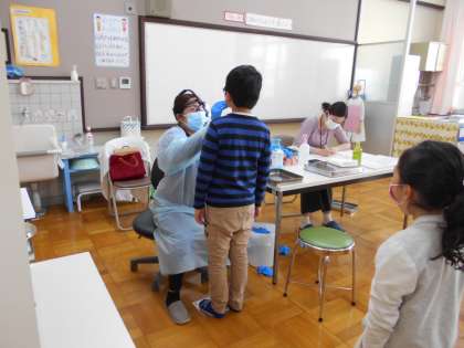 歯科検診がありました。4年生の子どもたちと一緒に並んで待ちました。「床のタイル2空けるよ!」と,子どもたちはソーシャルディスタンスを意識して,互いに声をかけあい,とても静かに待つことができていました。