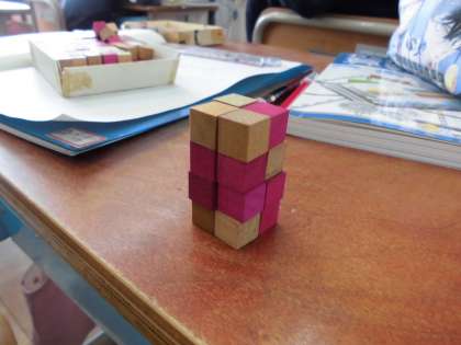 直方体や立方体のかさ(体積)は,1立方センチメートルの小さな立方体が何個分かで表すということを学んだあと,実際に1立方センチメートルの積み木をたくさん持ってもらって,積み上げてもらいました。