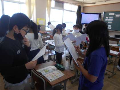 4年生・外国語での交流学習がありましたた。好きなスポーツ,好きではない(苦手などで)スポーツを「I like 〜」「I don't like 〜」で言い表し,友達に伝えました。