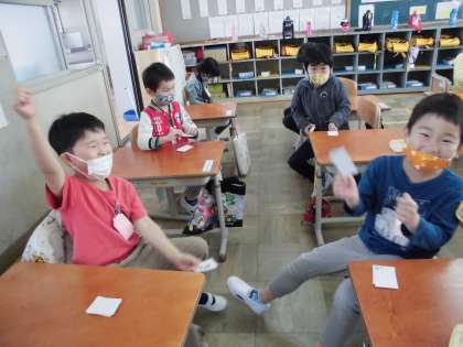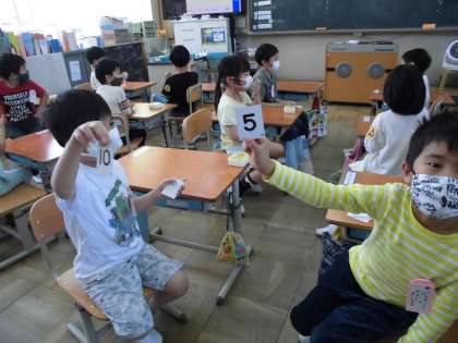 今日の算数は「1」から「10」までの数を色々なやり方でたしかめました。最後にペアになり,自分の数字カードを「せーの」で出し合って,その数の大小で勝負するというゲームをしました。シンプルですが子ども達にとってはとても楽しい学習だったようで,給食を食べ終わってからも,席の近くの子達と勝負する姿も見られました。やはりゲーム感覚の活動は,のりが違います。