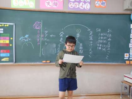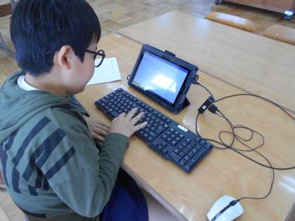 連休が終わって,国語の時間に「お休みの日の話」の学習をしました。コロナ禍で行動に制限のあるお休みでしたが,楽しかったことを「いつ・どこで・だれと・なにをしたか」「それをくわしく」「どんな気持ちがしたか」の項目のあるワークシートに書き,発表し,ipadで文章を入力しました。「えーっと,いなりはinariっと。」と,頭の中で文章をローマ字にしながら,