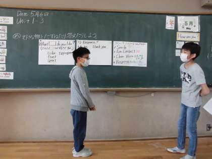 「What 〜do you like?」を使って好きなスポーツやカラー,フルーツやテレビ番組などお互いの好きなものを色々たずね合いました。相手に答えてもらった時のレスポンス(反応)も上手になってきました。次回はいよいよ,自己紹介,名刺交換をします。