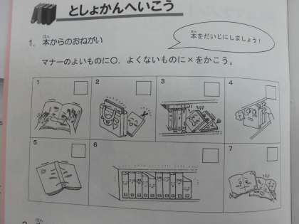 国語の学習で,学校司書の先生から 図書館での約束についてお話をしていただきました。京都市の小学校では,毎年4月に「読書ノート」というノートが一人1冊配布されます。自分の読んだ本を記録できるページや,図書室の本を使ってできる学習についてのページがあったりするノートです。昨日は早速それを使って,本の扱い方や探し方などについて教えていただきました。その後カウンターで一人1冊本を借りました。これからいっぱいいろんな本と出会ってほしいです。