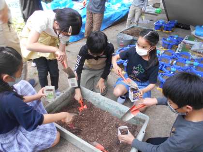 交流の理科で,4年生の友だちと一緒に,ツルレイシの種まきをしました。「土はふかふかのお布団のように,入れようね。」と先生に教えていただいたことを思い出しながら,牛乳パックに土を入れて種を蒔きました。土を入れるために,階段を降りていくときに,「(ろ組の友だちの)歩くペースに合わせよう。」と,そっとみんなで確認し合って,歩調を合わせたり,待ったりしてくれました。4年生のみなさん,ありがとう!ツルレイシが育っていくのが楽しみですね!