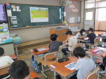 教科書のイラストを見て,〇に入る動物を見付けていました。