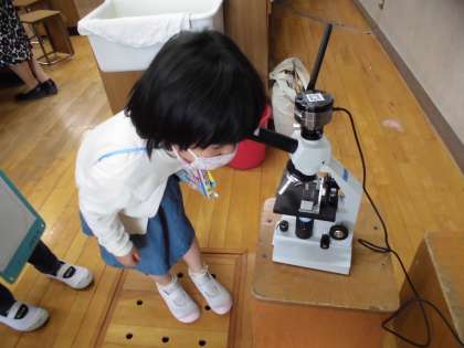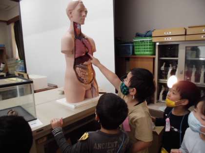 今日は理科室へ行きました。事前に後藤先生にお願いしておいたので,子ども達にとって興味深そうなものを色々と並べておいてくださいました。前回の音楽室とはちがって,今まで出合ったことのないものがたくさんあって,みんな感嘆の声を何度もあげていました。「どんなものが見つけられた?」とぜひたずねてあげてください!