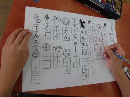 今日の国語は「濁音」のつくことばについての学習をしました。そこで登場したのが「てんてん忍者」。得意わざの「てんてんしゅりけん」を投げて,ことばを変身させてしまうのです。そこでみんなも弟子になって修行をしようとがんばりました。てんてんのつく言葉集めもしたのですが,さがし出すと思っていた以上に見つかって,「てんてん」のつく言葉は多いなあということも感じているみんなでした。