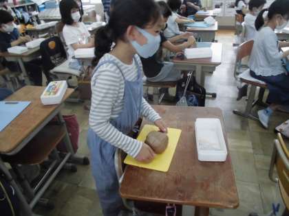 図画工作では,糸やへらを使って,油粘土を切ったり,かき出したりして,「見たことない〇〇」を作りました。糸を使って切ったところを生かして恐竜の口を作ったり,ストローを使って粘土をかき出して動物の体の一部を作ったり,思い思いの作品を作りました。久しぶりの粘土での工作を楽しんでいました。
