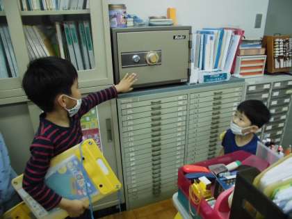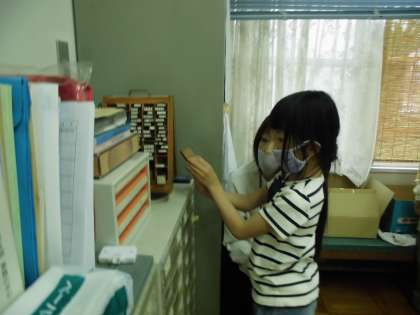 こちらもふだんの子どもたちの生活の中ではイメージしにくい「事務室」。部屋に入らせてもらうなり,「わあー!」と声が上がりました。子ども達が毎日の学習の中で使う色とりどりの折り紙や色画用紙など文具用品に気づいてほしいと思っていたのですが,子どもたちの関心は「金庫」や「書類のいっぱい入っている棚」や「シュレッダー」の方に向かっていました。でも実際にたんけんに行かせてもらって「こんなお部屋なんだなあ。」という感じは味わえたことと思います。