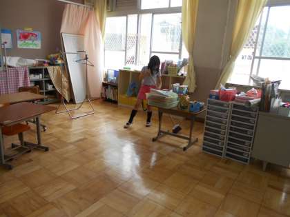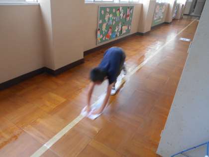 いつもそうじ時間には,交流学級・4年1組の中から2人の子どもたちが一週間の当番で順番に来てくれています。週初めはみんなで一緒に教室をそうじして,その後は教室と廊下に分かれて,そうじをしています。いつも一生懸命にそうじをしてくれて,とてもうれしいです。