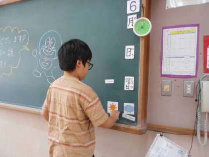 毎日の朝の会で,自分で今日の月日曜日の他に,今日の天気の掲示をしています。いつも,細かく,「晴れのち曇り」「晴れのち雨」など掲示してくれるので,聞いてみると,毎朝・夕方のニュースで,京都と他に自身に親しみ深い他府県の天気もチェックしてくれているそうです。先週は,朝に晴れていて,予測してくれていた通りに夕方に雨になって感心しました。