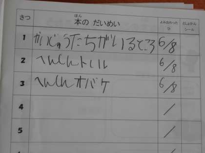 今日,ひらがなの「を」を習ってこれですべてのひらがな学習が終わりました。そこで早速今日から「読書ノート」を使っていくことにしました。自分の読書活動の足あとを残していくためのノートです。読んだ本の題名を記録していきます。100さつ分書きこめるようになっていることを話すと「がんばって読もう。」という声も聞こえていました。中間休みに,ノートを抱えて図書室に出かける子たちが多く見られ,はりきっている気持ちが伝わってきました!