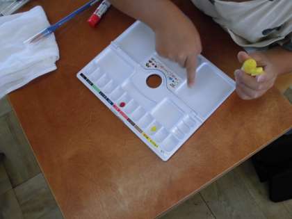 その後,パレットに恐る恐る絵の具を出す子どもたち。