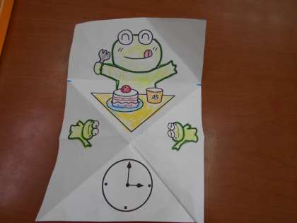 自立活動の学習で,楽しく手作業をすることで,手指の操作性を育もうと考えています。「おり紙マジックワンダーランド」という本から,「タイムトリック」という折り紙をしました。折った紙をめくったり,方向を変えたりすることで,カエルさんの生活時間が変わっていきました。