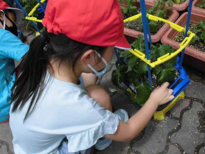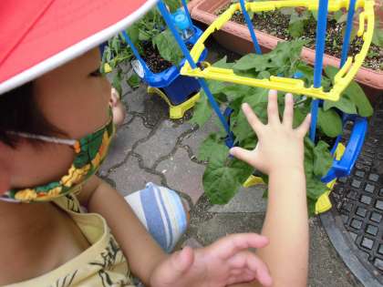 今朝登校すると,またこの土日でぐ〜んと成長していたあさがお。これは次の肥料をあげなくては!ということで,みんなで外に出て土の上にまきました。その後,茎をさわったり,大きくなったはっぱを自分のてのひらと比べて見たりして,自分のあさがおの元気しらべをしました。