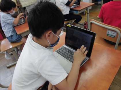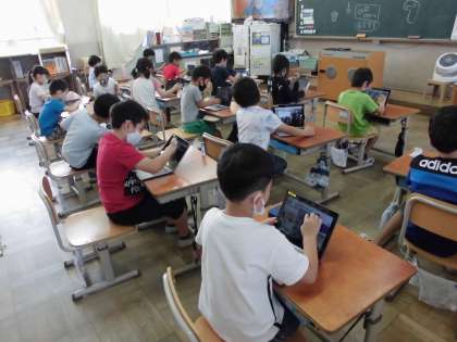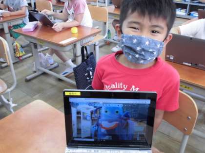 昨日の様子とは大違いで,あっという間にサクサクとログイン完了!子ども達の吸収力って本当にすごいです。そこで今日のめあて「カメラで撮った写真に絵やことばを描き加える」という活動に挑戦しました。今日は出来た作品をうれしそうに「見てください!」の声が絶えませんでした。ということで今日はまず,身の回りの色々な物を写真に撮ってから楽しいお絵描きタイムの1時間でした。