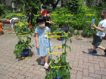 よく見ると小さなバッタがアサガオの葉にとまっていました。