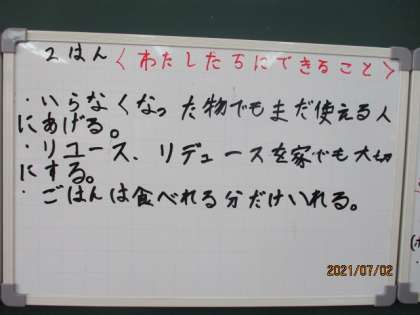 くらしとごみの学習が終わりました。燃やすごみ,資源ごみの処理の仕方を知った子どもたち。最後の時間に子どもたちは,ごみを減らすために〈わたしたちにできること〉を考え,グループでまとめました。「使い終わった歯ブラシをそうじに使う。」「牛乳パックを再利用する。」など様々な意見が出ました。自分ができることから少しずつ行動を起こせたらいいですね。