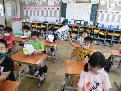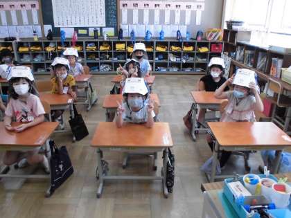 今日は,初めて「防災ヘルメット」の練習をしました。いざというときに頭を守ることの大切さについて話をしてから,始めました。まずはフラットにたたんであるヘルメットをかぶれるように組み立てました。そのあと実際にかぶってみました。お互いに見合って,ちょっとにやにやしていた子ども達でした。そのあとは,外してたたんで練習終了。終業式の日に持ち帰ります。おうちでも一度練習をしてみてください。