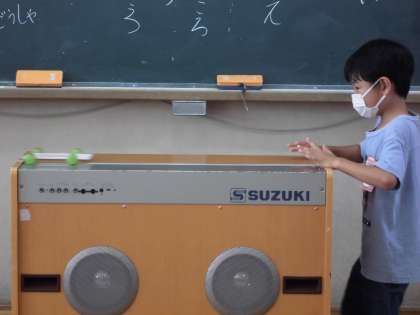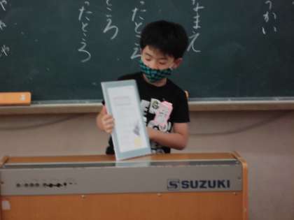 今日は,夏休みにがんばって取り組んできた「自由研究」を順番に発表しました。「作品名」と「がんばったことやむずかしかったこと」の二つを実物を見せながら話したのですが,聞いている子ども達からは。「すごいなあ。」や「がんばったなあ。」などのつぶやきも自然と起きていました。そのあとは自由に自分が気になる作品をじっくりと眺めたり,試させてもらっているうちに5時間目が終了。もっと時間が欲しそうな子ども達でした。