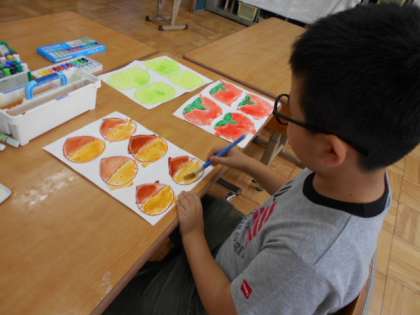 図工の時間には秋らしさを絵に描いています。秋の果物・野菜の色を絵の具で塗っています。今日は,その,果物・野菜の色を塗り終えました。それを,今後,模造紙に貼り付け,ろ組の前の10月の掲示板に飾ります。この果物・野菜の他に,かわいらしい何かの絵が加わります。さてどんな絵になるでしょうか?お楽しみに!