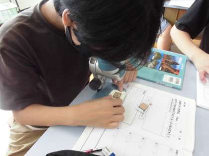 という問題を調べるために,このはぎ取り標本のしま模様を作っているサンプルをひとりひとりに渡し,スコープで観察しました。