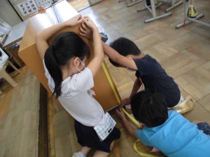 今日の算数は「大きさくらべ」の学習で,「高さくらべ」に挑戦しました。すでに学習したえんぴつやひも,ノートなどのように自分では動かせないものでもテープやひもを使えば,ながさをくらべられるねというところからスタートして,「自分のつくえ」「オルガン」「ロッカー」の高さくらべにグループで協力して取り組みました。