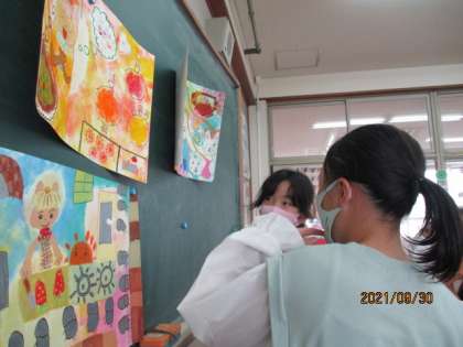 絵を描いてきました。写真は完成した絵をお互いに見せ合っているところです。