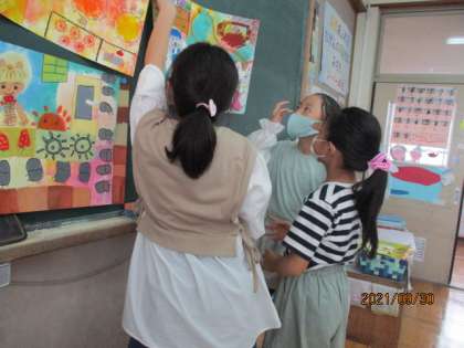 アドバイスをしながら,自分の絵を遠くから見ながら描いています。