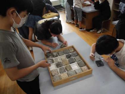 復習をしたあと,余った時間は理科室にある様々な岩石や化石の観察をしました。