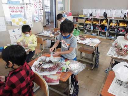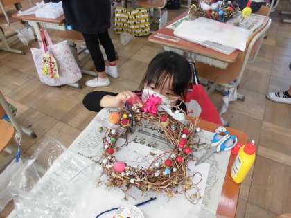 今日は朝から「こんなん持ってきたあ。」とうれしそうにリースの材料を入れ替わり立ち代わり見せにきてくれていた子ども達。1,2時間目のミニ運動会の練習も終え,みんな大喜びでリースづくりを楽しんでいました。ハロウィン風のリース,クリスマス風のリース,秋の自然いっぱいのリースなどなどいろんな味わいのリースが出来上がっていきました。おうちの方にどんぐりや落ち葉を集めにいっしょに行っていただいた子達もいたようです。ありがとうございました。