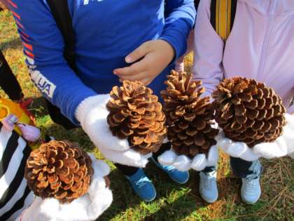 お〜きなまつぼっくりを見つけるとみんなで次から次に拾いに行きました。