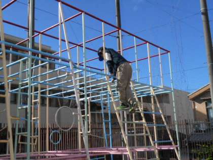 毎朝の「日常生活の指導」の学習の様子です。楽しく意欲的に遊具を昇り降りして,全身をバランス良く使う学習をしています。
