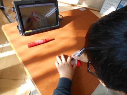 図工では,12月の掲示板に貼り付ける動物等の折り紙をしました。動画を見ながら,折りました。