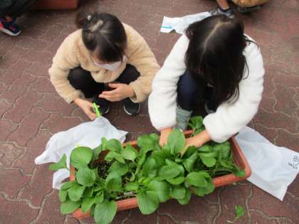 すっかり大きく育った小松菜をまびくのは,なんだか収穫しているような気分になったようです。