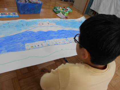 図工では先週から,1月の掲示板の絵を描き始めています。1月から新年のイメージを膨らませ,富士山・日の出と富士山特急を描いています。