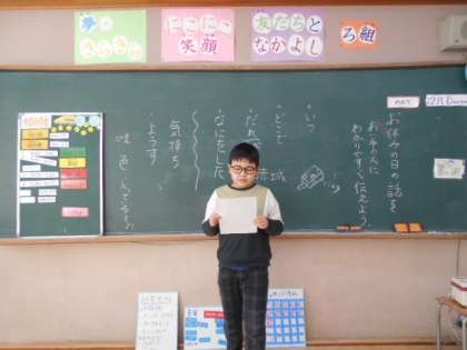 国語ではお休みの日の話を,「いつ・どこで・誰が・何をしたか,様子・気持ち」の視点からメモをして文を作り,発表してからword文書に文を入力し,その内容に関連する画像を添付しました。