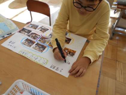 2学期のたてわり活動の写真を見て,ふりかえりながら掲示物を作りました。